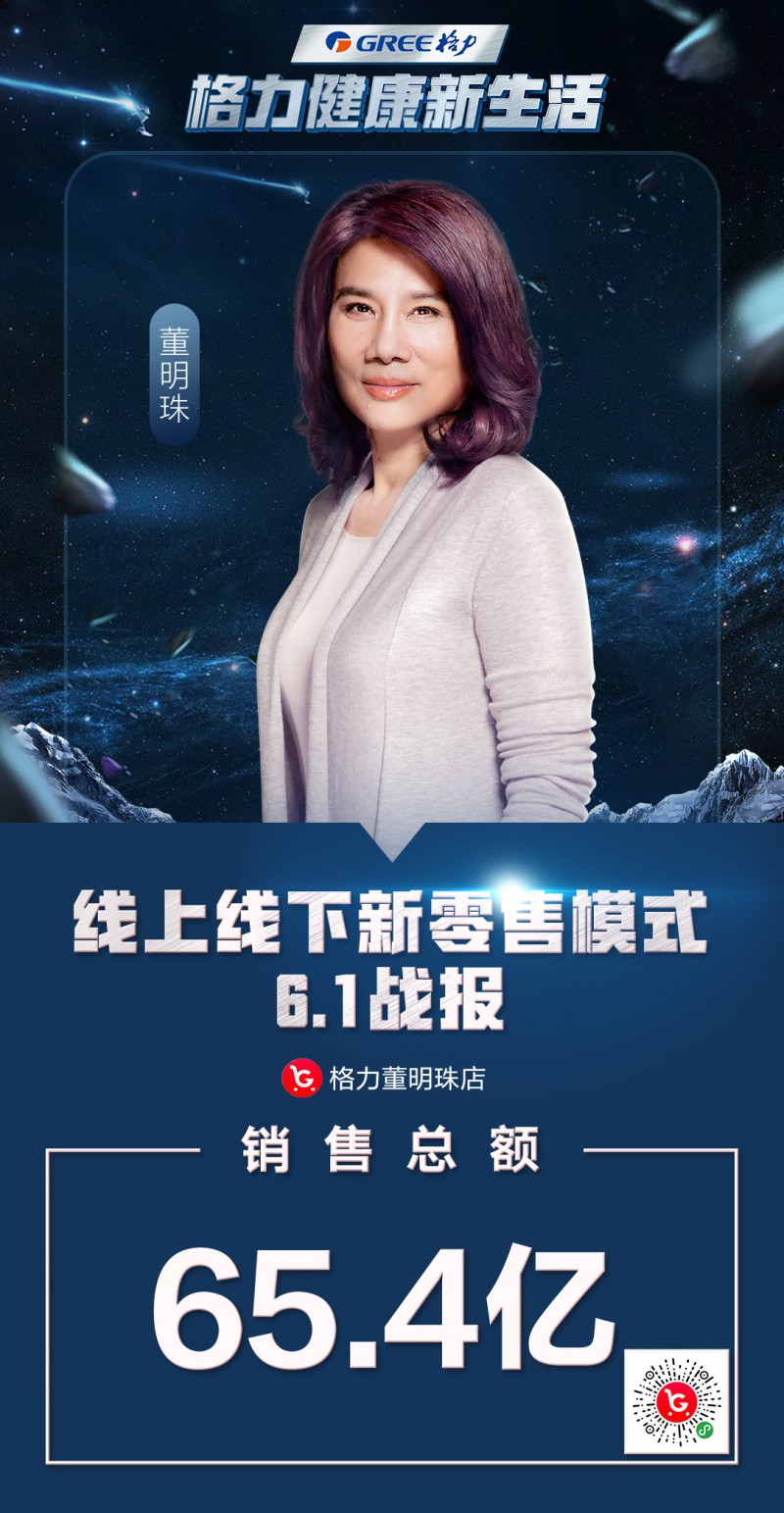 6月1日,格力“健康新生活”品牌日直播活动在“格力董明珠店”等平台同步上线。董明珠与任泉、王自如、李海川、姜华、王羽潇等嘉宾共同直播,上半场通过参观格力国家重点实验室、自动化工厂等形式展示格力科研实力,下半场以“新生活、新饮食、新呼吸”为主题推介格力创新科技产品。本次活动实现了直播2分钟销售额破亿、上半场直播销售额破10亿、全天销售额65.4亿的亮眼成绩,再次创下新记录。