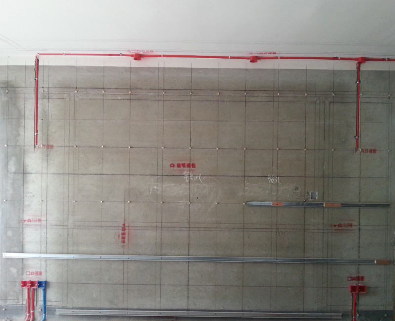 ① 根据深化图纸在墙面上放出各种装饰面层的完成面线。