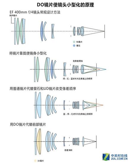 在目前的应用中,普遍厂商使用多层衍射镜片的原因是利用它和普通镜片相反的色散特性。普通镜片产生的色散是蓝绿光这样的短波长可见光在靠近镜头的方向,而红色这样的长波长光线在远离镜片的方向;而多层衍射镜片则具备相反的效果,红色散靠近镜片,绿蓝色散远离。大家看图片会更加容易理解!