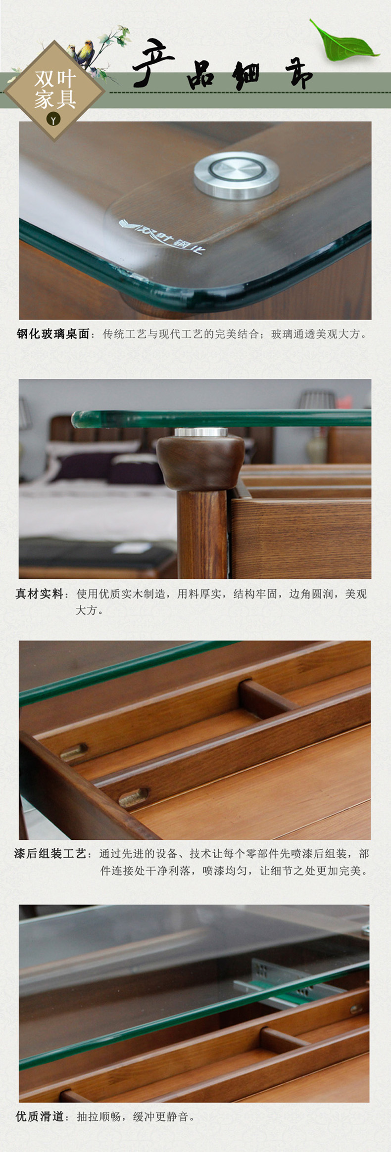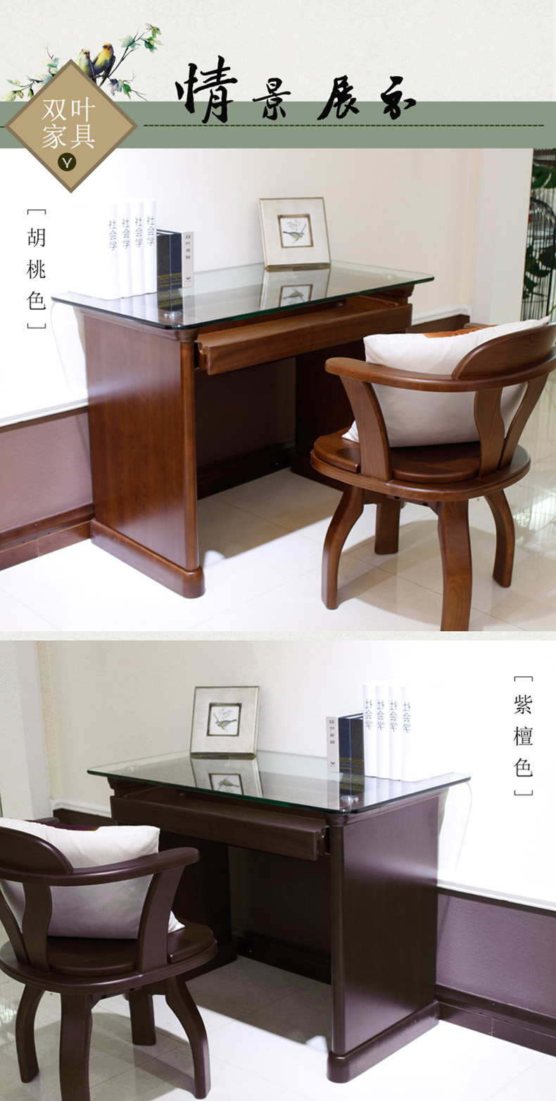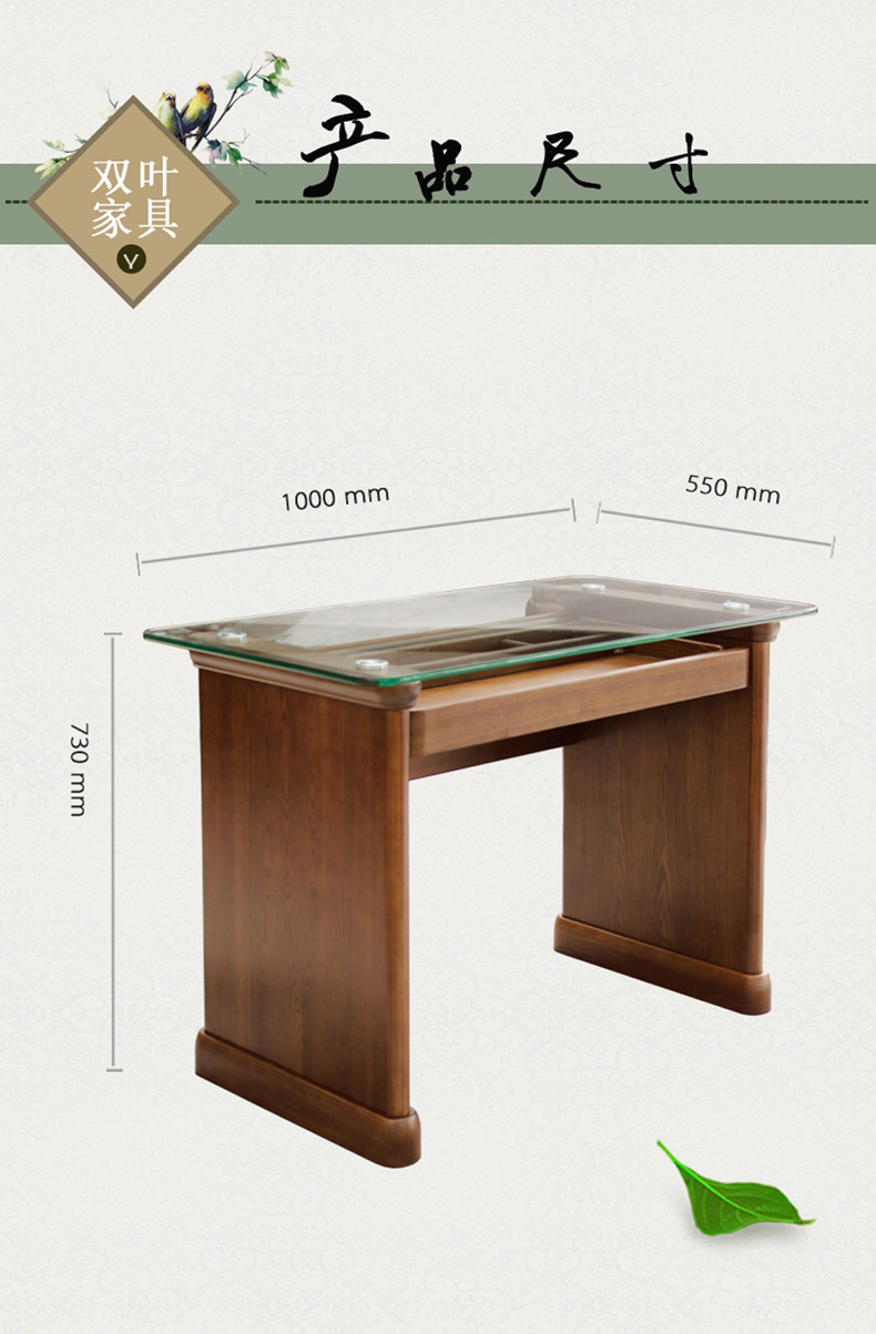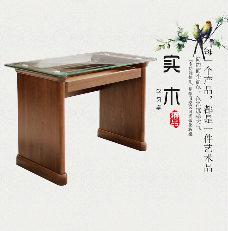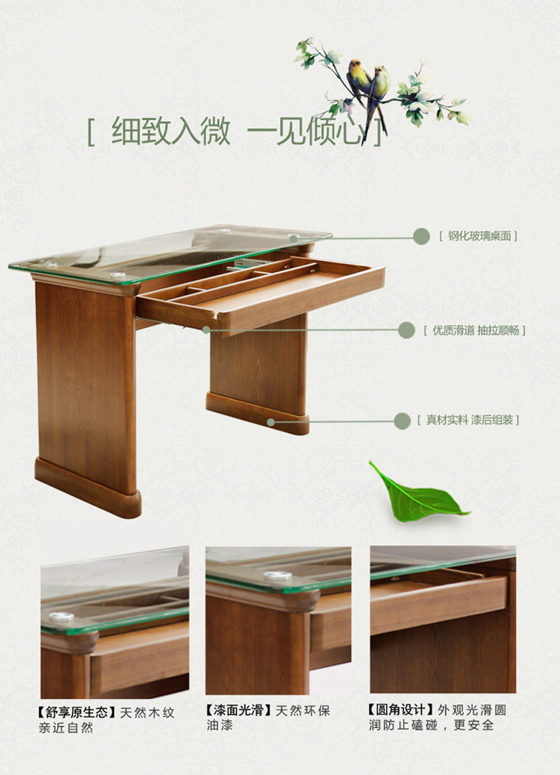 双叶家具 实木中式现代 玻璃面休闲学习桌卧室梳妆台梳妆桌带抽屉