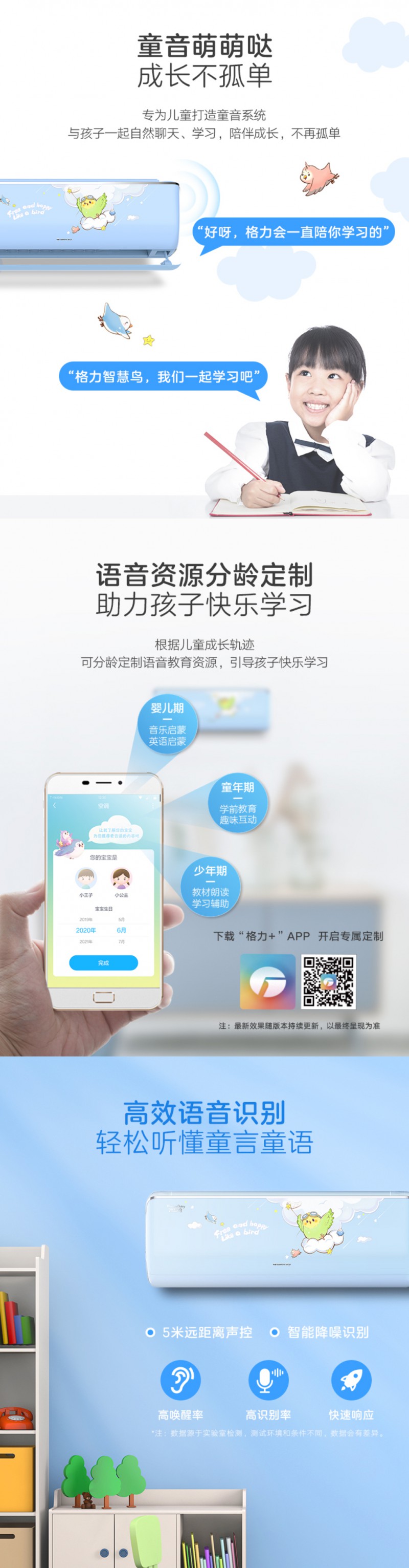 孩子喜欢的,爸妈放心的,就是儿童专属的空调。 智慧鸟童趣外观,激发孩子创造潜力。格力AI萌音科技,孩子的智趣伙伴。儿童安心睡眠科技,爸妈的宝贝安睡神器。格力儿童语音空调,陪伴孩子快乐成长。