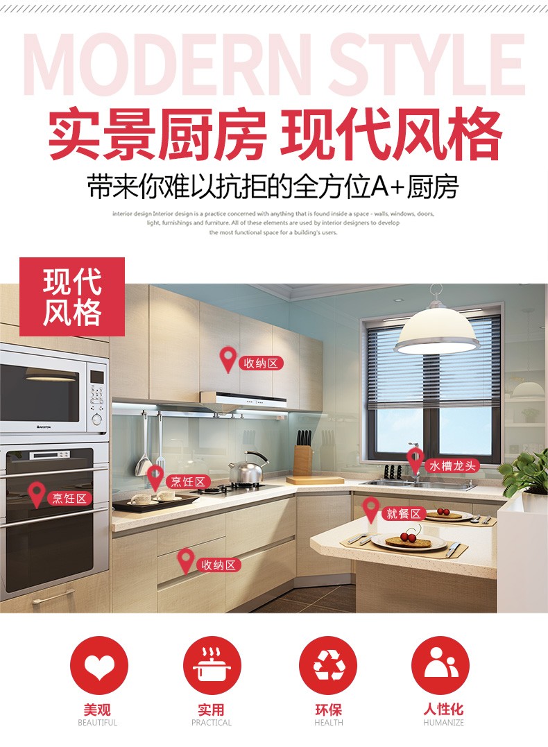 使用防蟑静音封边的柜体,柜门关闭时冲击力得以缓解,消除噪音,防止蟑螂等虫进入,有没有防蟑封边的成本相差3%。还要查看台面板、门板、箱体和密封条、防撞条是否经机器膜压处理,是否正反两面一封压制而成。密封条封闭不严,会造成油烟、灰尘、昆虫进入。