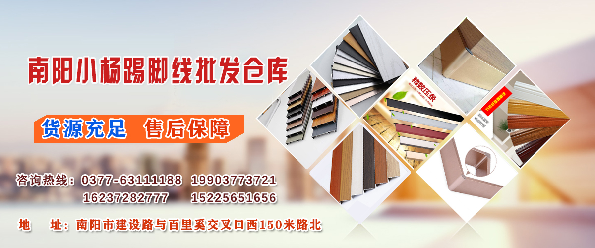 南阳小杨踢脚线批发仓库位于南阳市建设路与百里奚交叉口西150米路北,本公司以仓储式批发为主,展厅展示了上百种花色,可满足客户不同装修风格的需求。本公司专业批发各种地面装饰线条、各种品质踢脚线(竹木纤维,实木,铝合金)、地板收口条、木地板各种配件及装修(瓷砖)地面保护膜。