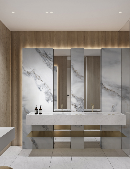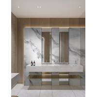 (2)卫浴应用:整洁大方、浑然一体的时尚外观,0吸水率、0渗透易洁防污的优异性能,小空间营造大视野享受,升华岩板搭配随心所欲,轻松驾驭各类空间风格。