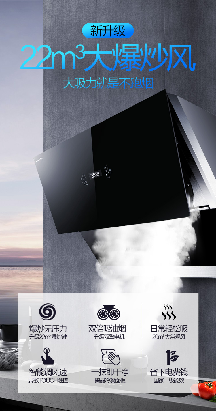 - 烟机排风量:排风量22(m3/min)及以上
