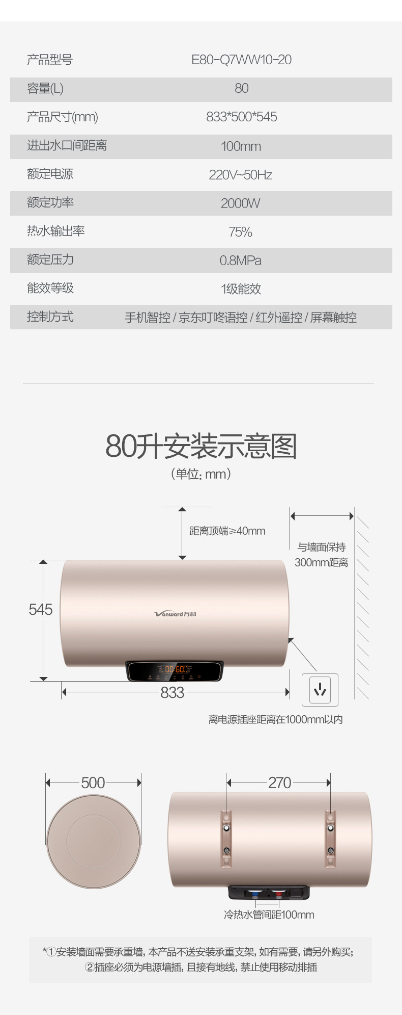 详细信息 万和 (Vanward )80升电热水器一级能效智能断电双管速热高温杀菌wifi智能E80-Q7WW10-20