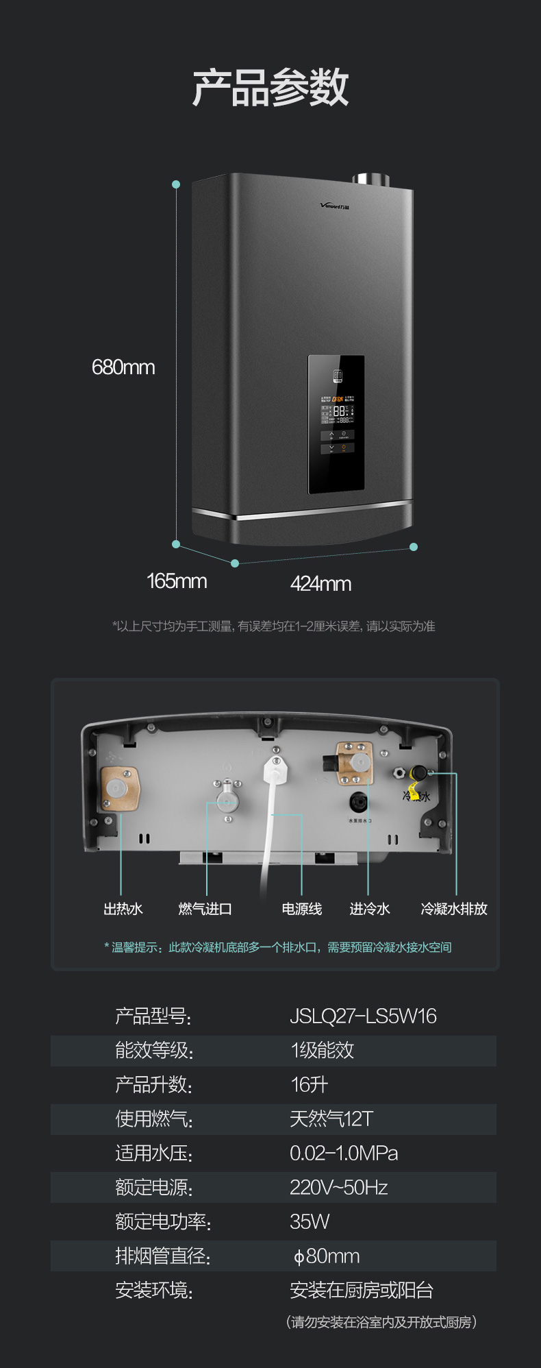 详细信息 万和 (Vanward )16升零冷水燃气热水器水气双调一级能效冷凝式天然气热水器增压JSLQ27-LS5W16