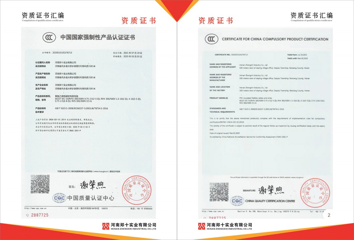 产品名称:聚氯乙烯绝缘软电缆电线; 系列、规格、型号:60227 IEC 53(RVV) 300/500V 0.75-2.5(2-5芯);RVV 300/500V 1.5-10(2芯),4-10(3-5芯),0.75-2.5(6-8芯);RVS 300/300V0.5-6; 证书图片 |