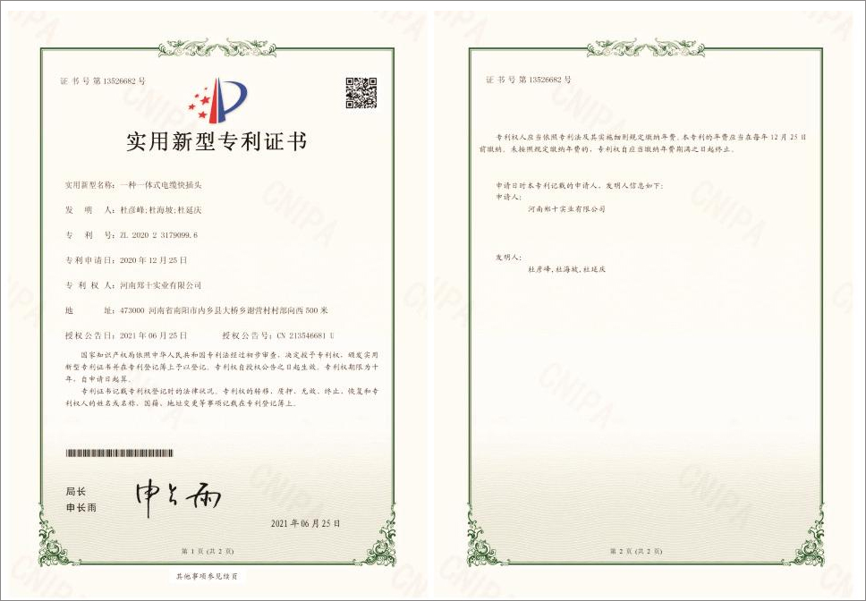 一种一体式电缆快插头 实用新型专利证书