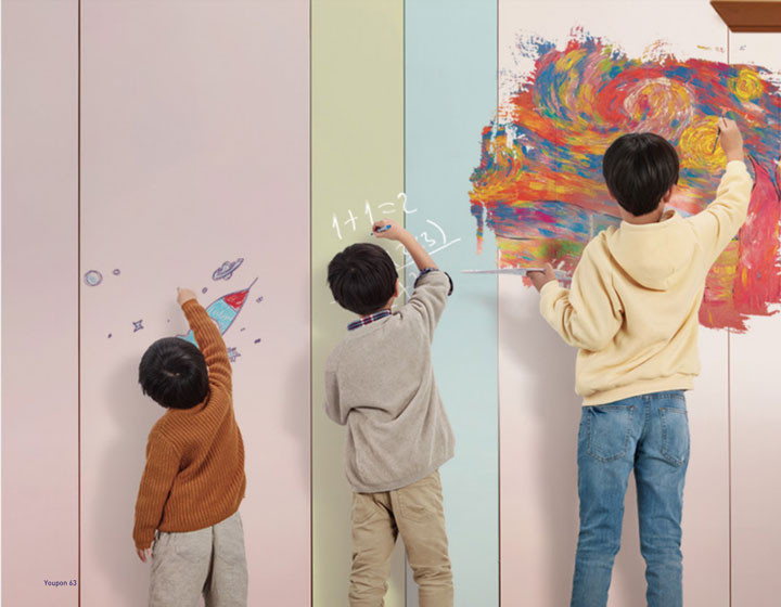 友邦擦擦儿童墙采用防火、耐磨、防潮、无污染的5K 木材质,表面覆盖着杜邦特能膜,能有效抵御各种涂鸦与油污, 顽固污渍也可以轻松去除。