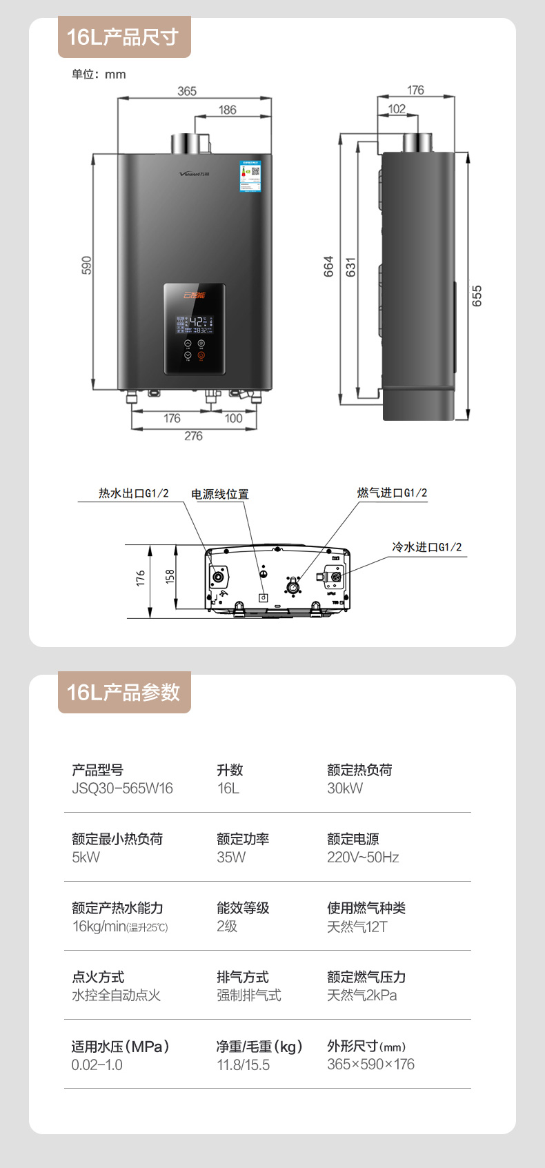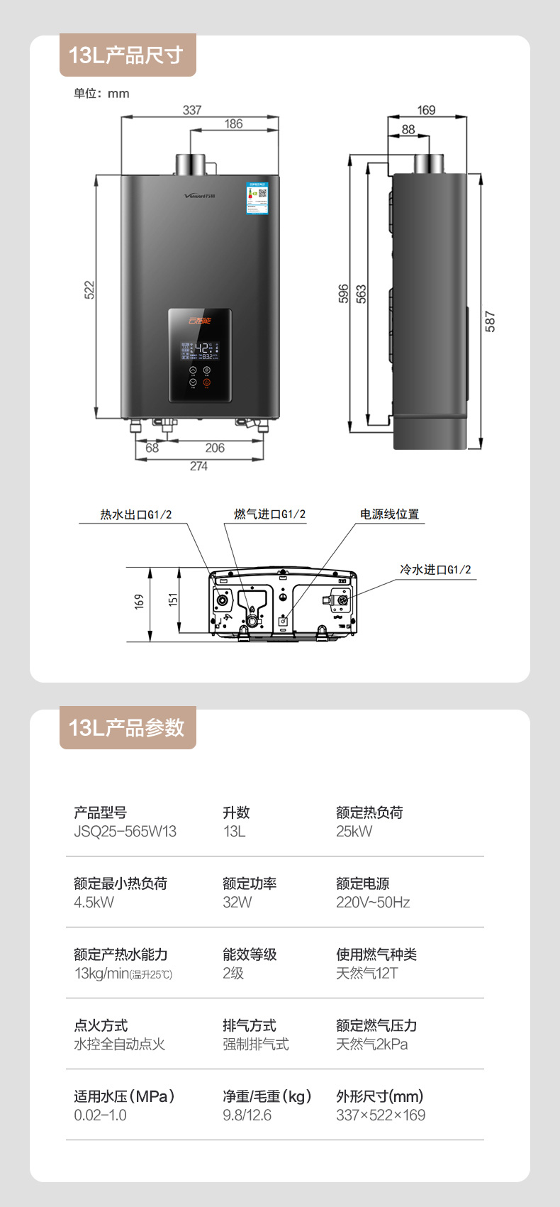 万和燃气热水器电家用天然气恒温13升洗澡即热式智能16L强排565W