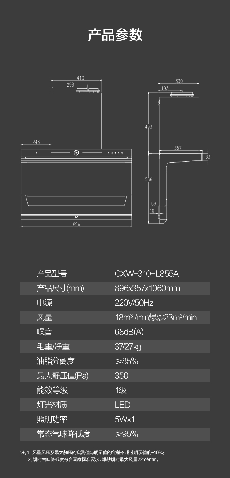 • 油烟机排风量: 18立方米/分钟