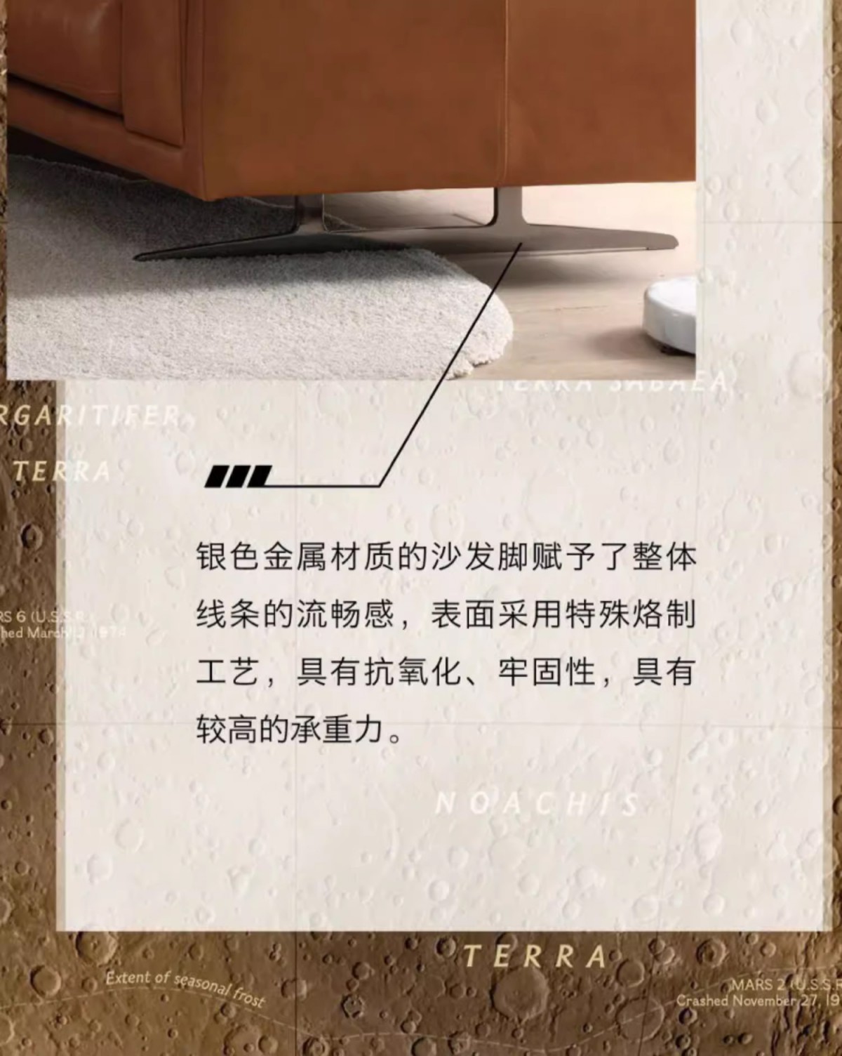 低靠背贴合身体的需要,坐垫的填充物为高密度海绵和羽绒,坐感柔软舒适,独特的高脚设计勾勒出外刚内柔的优美视觉效果,宽大的扶手提供了手臂最佳的位置,悠悠然享一份无尚尊贵与优雅。